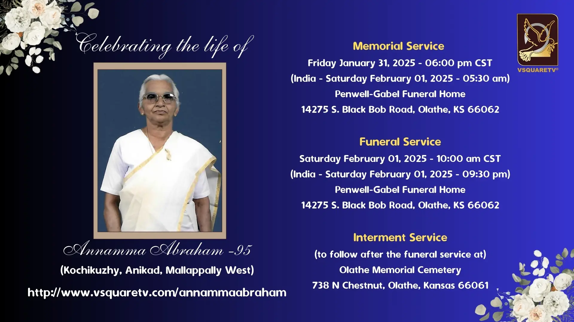 oin family and friends in honoring Annamma Abraham’s remarkable life at her memorial service on January 31, 2025, at Penwell-Gabel Funeral Home, Olathe, KS. The service will include a live streaming webcast, allowing loved ones from around the world to participate. Further tributes will continue with a funeral service and interment on February 1, 2025, at Olathe Memorial Cemetery. This is a significant opportunity to reflect, share memories, and say final goodbyes. All are invited to celebrate Annamma’s legacy, whether in person or online.