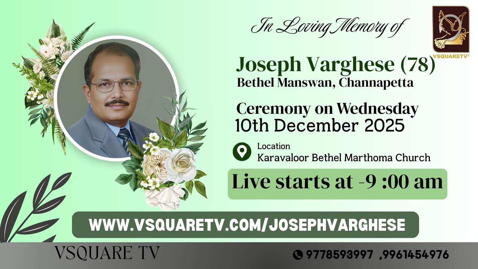In loving memory of Joseph Varghese (78), cherished member of VSquareTV and Bethel Manswan, Channapetta. Join the funeral ceremony live on Wednesday, December 10, 2025, at Karavaloor Bethel Marthoma Church, Kollam, Kerala. Stream begins at 9:00 AM IST via VSquareTV’s trusted webcast service