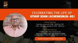 Portrait of Ammini Alexander, Vadakkedathu Pakalomattom, Vayyattupuzha, with funeral live stream details for January 5, 2026.